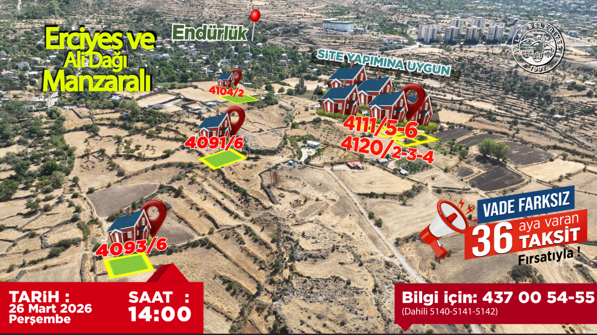Talas Belediyesinin, ilçenin en gözde lokasyonlarında yer alan villa parsellerini satışa sunduğu ihalede sona gelindi. Akçakaya ve Endürlük mahallelerinde bulunan toplam 20 adet villa parseli, uygun ödeme koşullarıyla 26 Mart Perşembe günü vatandaşların yatırımına açılıyor.