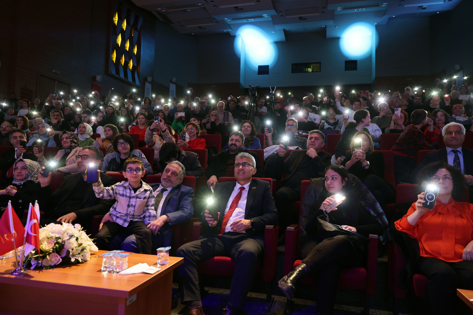 Başkan Yalçın’ın sözleri salonda büyük alkış alırken, program sonunda sanatçıya çiçek takdim edildi.